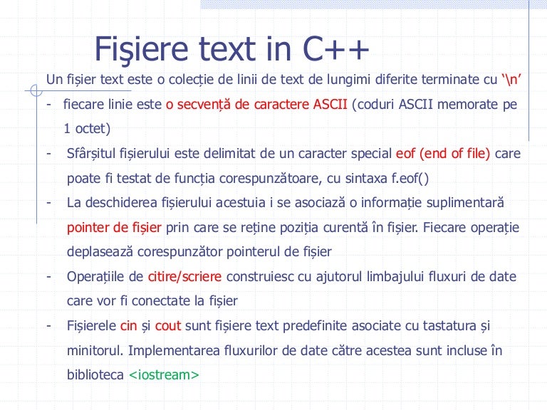 vizitati articolul complet aici : https://issuu.com/alifan/docs/fisiere_in_c Partea cu opţiunile poate lipsi. În c++ există mai multe modalități de lucru cu fișiere text. Citire din fisier if (fin.eof()) break;